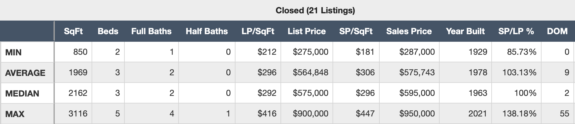 The table below shows a snapshot of the homes sold last week - lowest, highest, median, and average as well as days on market and percentage of selling price to listed price.